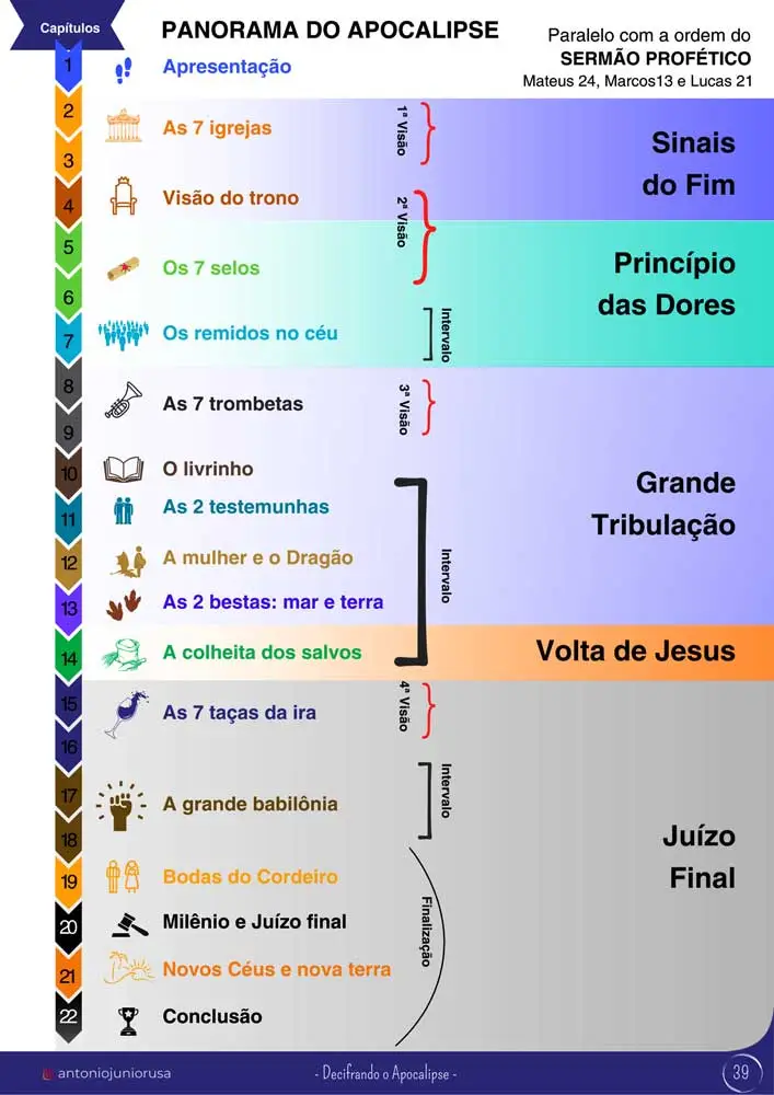 Muitas vezes você já desanimou quando começou a ler esse Livro e não entendeu como as histórias se interligam. Nosso Estudo Decifrando o Apocalipse uma análise Panoramica e Cronológica, ou seja, contará as histórias levando em contas as interpretações mais conhecidas e o contexto cultural da época.